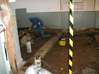 Wednesday morning and AMS 2000 Ltd are at the Hall removing the asbestos based products that had been used to pack some of the old joists nearest to the stage end of the Hall. All the asbestos was bagged and removed and the whole area vacuumed. We have a Certificate of Cleanliness.